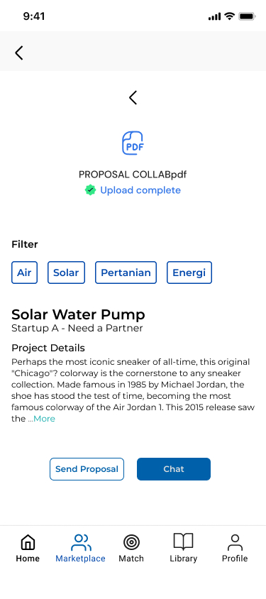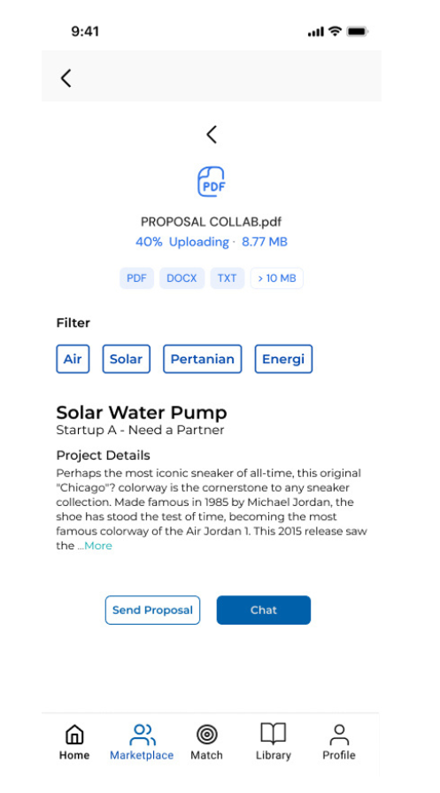 Scene : Peneliti dan partner melakukan match dan membuka halaman detail proyek untuk membahas kebutuhan, timeline, serta kontribusi masing-masing. User action : Mengunggah dokumen pendukung, mengisi informasi peran, dan menyetujui rencana awal kerja sama.